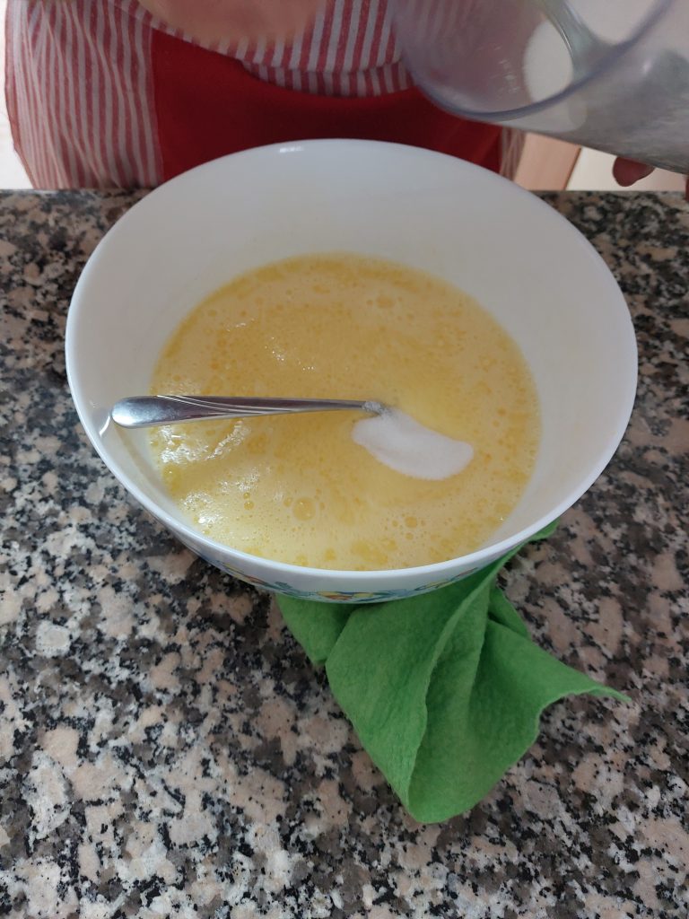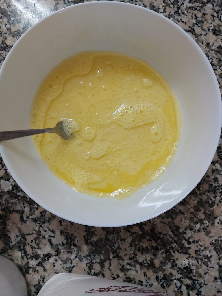 1- En un bol batimos bien el huevo y le añadimos los elementos líquidos (el aceite, la leche y el anís) Posteriormente mezclamos bien todos los ingredientes.