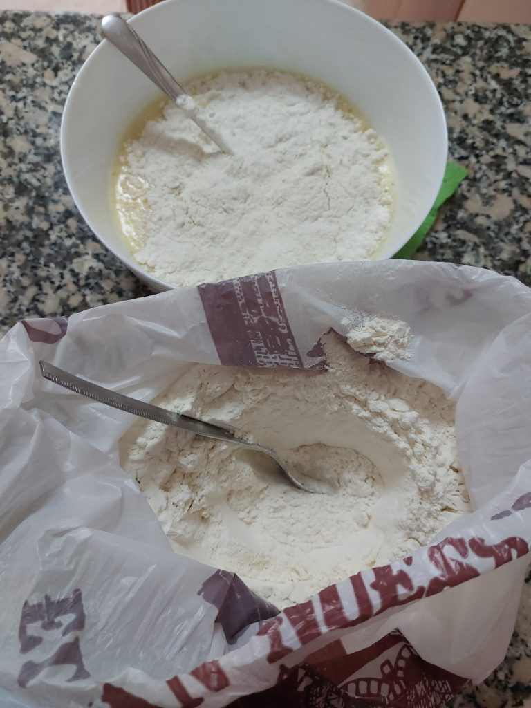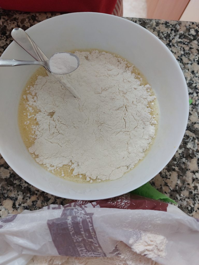 3- Comenzamos a echarle la harina y le añadimos la cucharadita de levadura. Se le añade la harina que admita la masa.