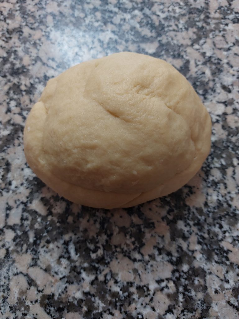 4- Vamos mezclando con harina y amasamos hasta que nos quede una masa como la de la foto. Como consejo es útil añadir un poco de harina sobre la superficie en la que se va a amasar la masa para que este no se pegue a ella.