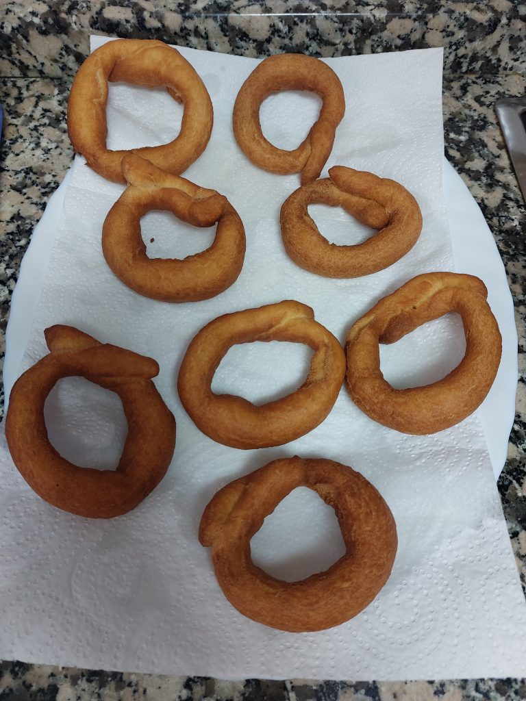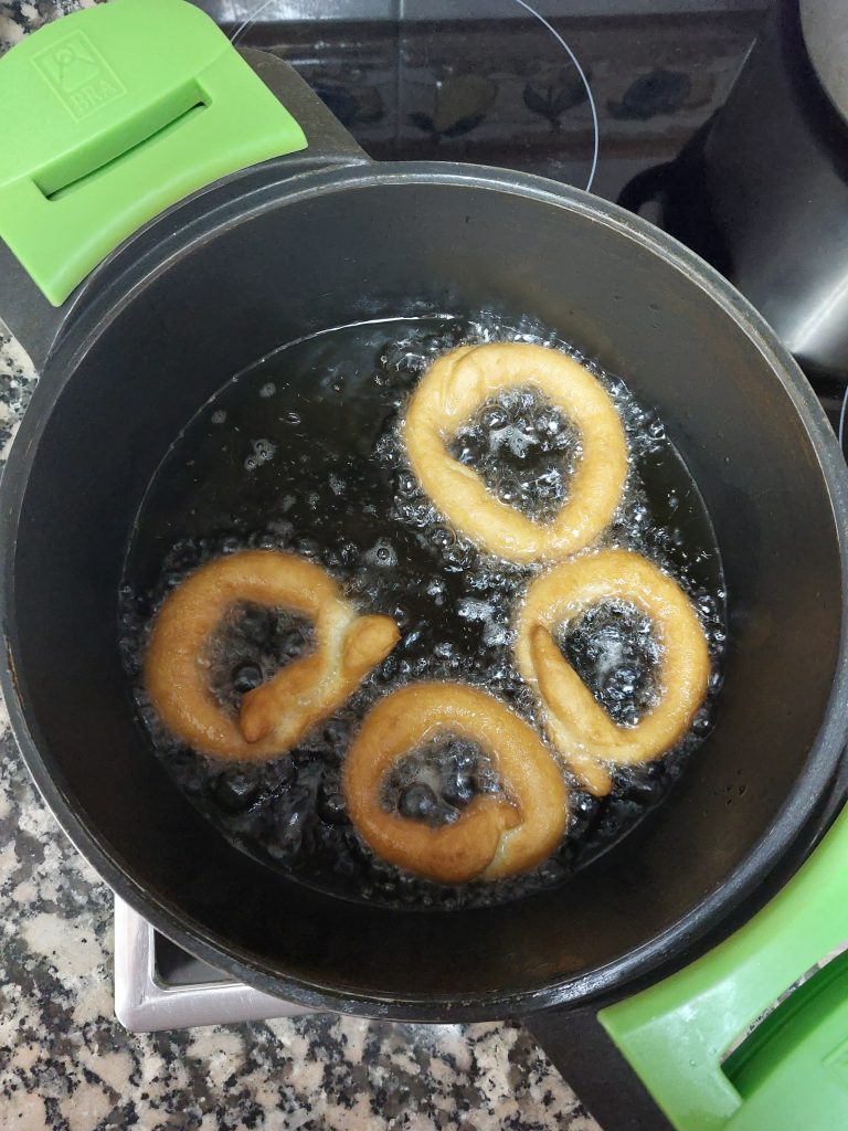 6- Freímos las rosquillas en abundante aceite de girasol que estará a unos 190ºC hasta que queden doradas.