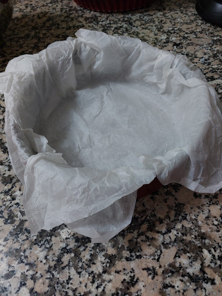 2-Añadimos a un molde desmontable papel vegetal. Para que el papel se acople mejor al molde es aconsejable mojarlo un poco con agua, arrugarlo, y posteriormente ponerlo en el molde dándole forma.