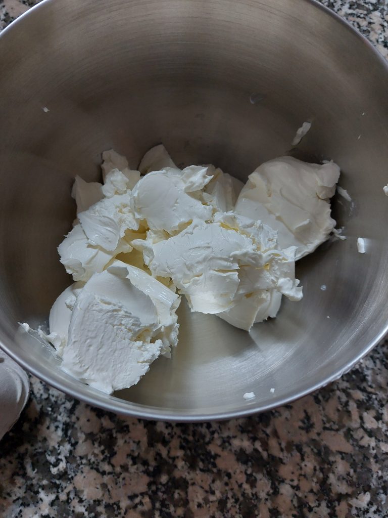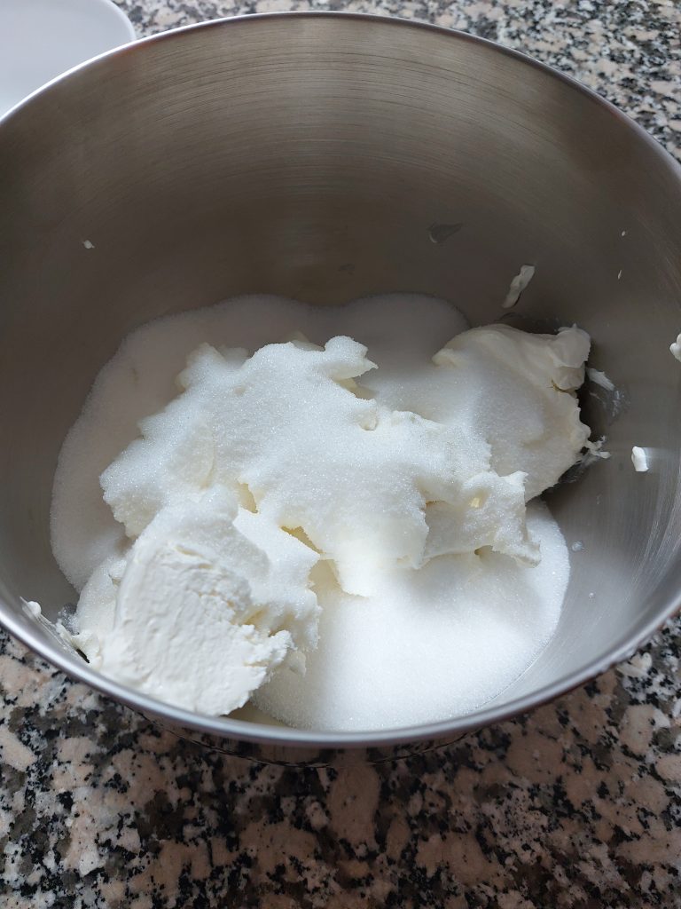 3-Ponemos todo el queso crema en un bol y le añadimos el azúcar. Posteriormente lo mezclamos