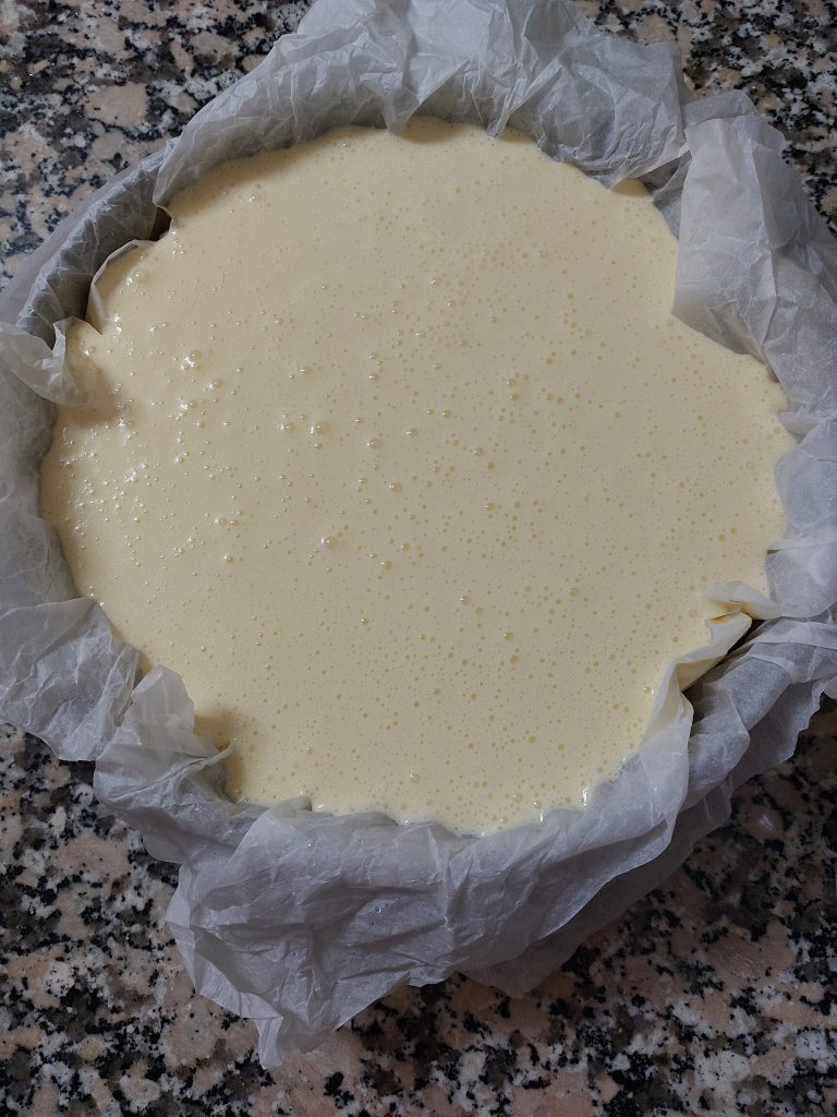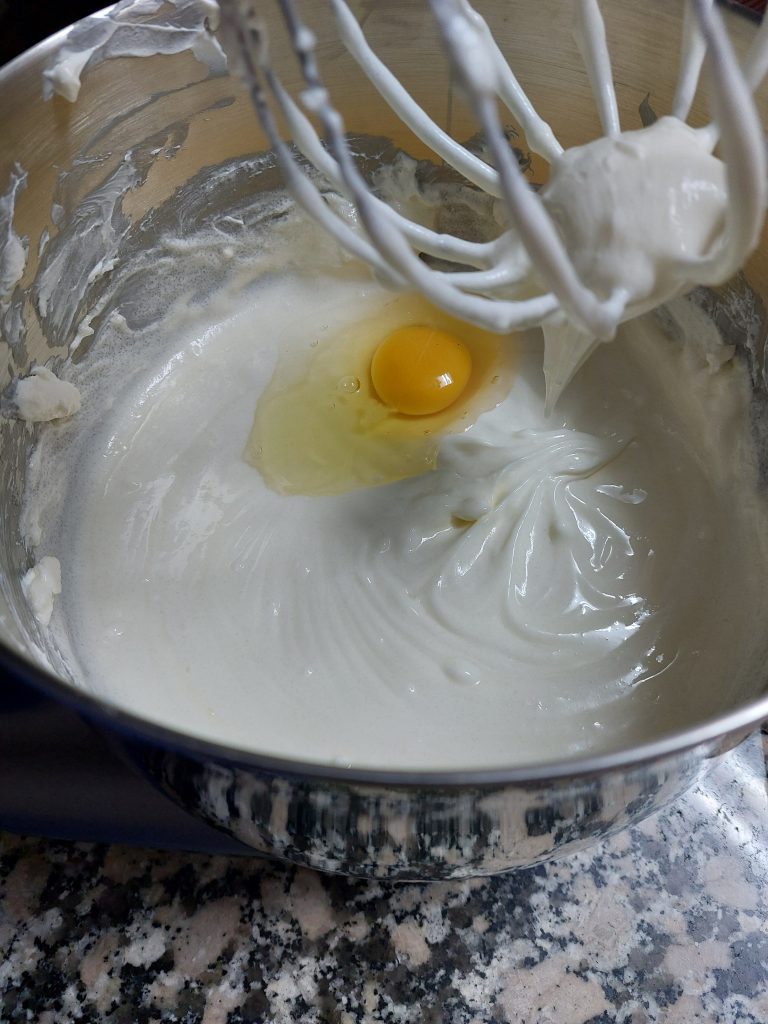 4-A la mezcla de queso crema y azúcar se le van añadiendo los huevos uno a uno dejando que se mezclen con la masa antes de ir añadiendo el siguiente.
