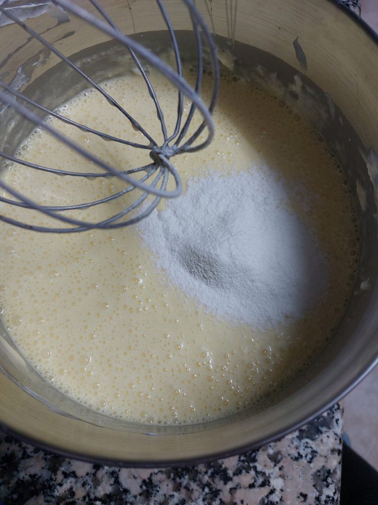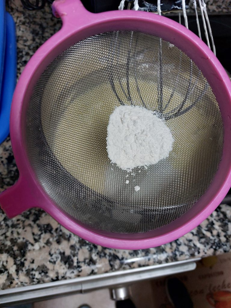5-Tamizamos la harina, la añadimos a la masa y mezclamos. (Tamizar consiste en pasar la harina por un colador para eliminar los grumos)